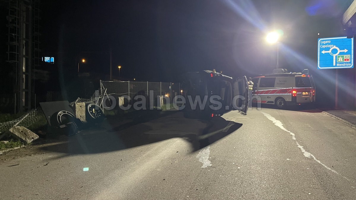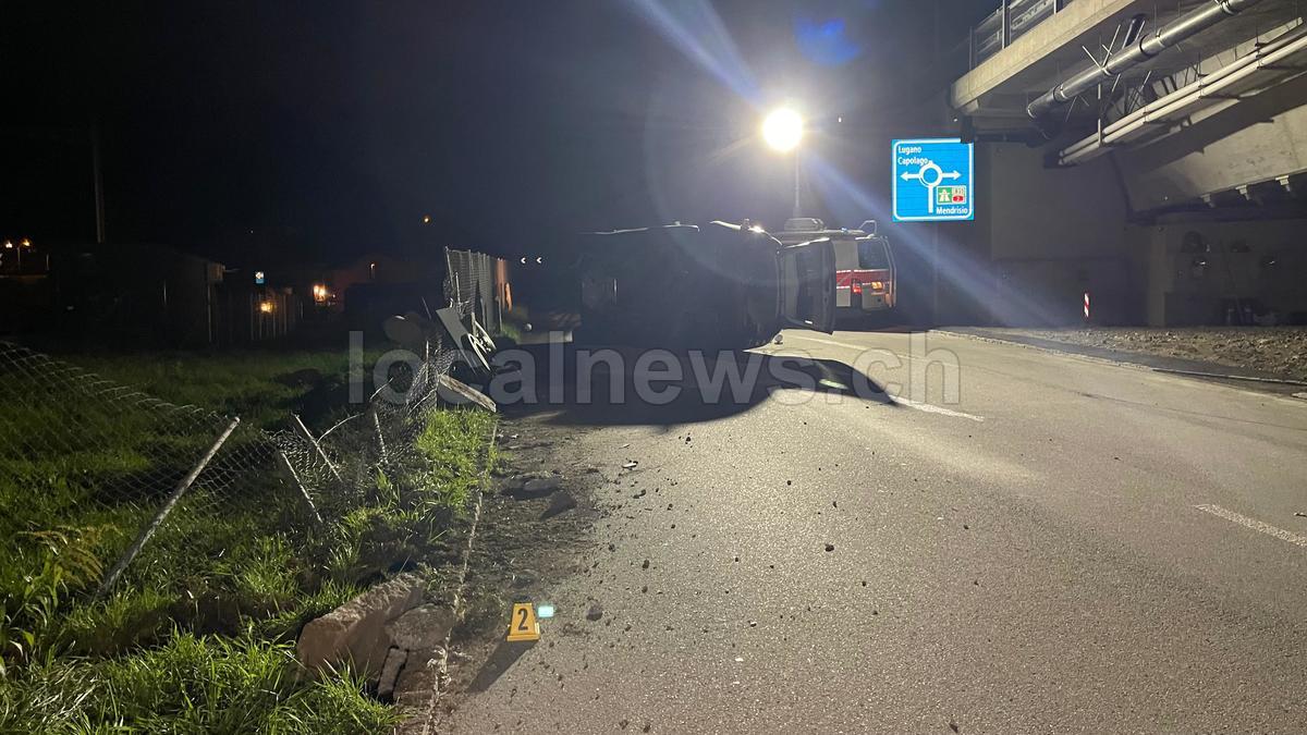 Perde il controllo dell'auto e si ribalta: un ferito grave in un incidente a Mendrisio, lunedì 27 ottobre 2025, ore 21:15